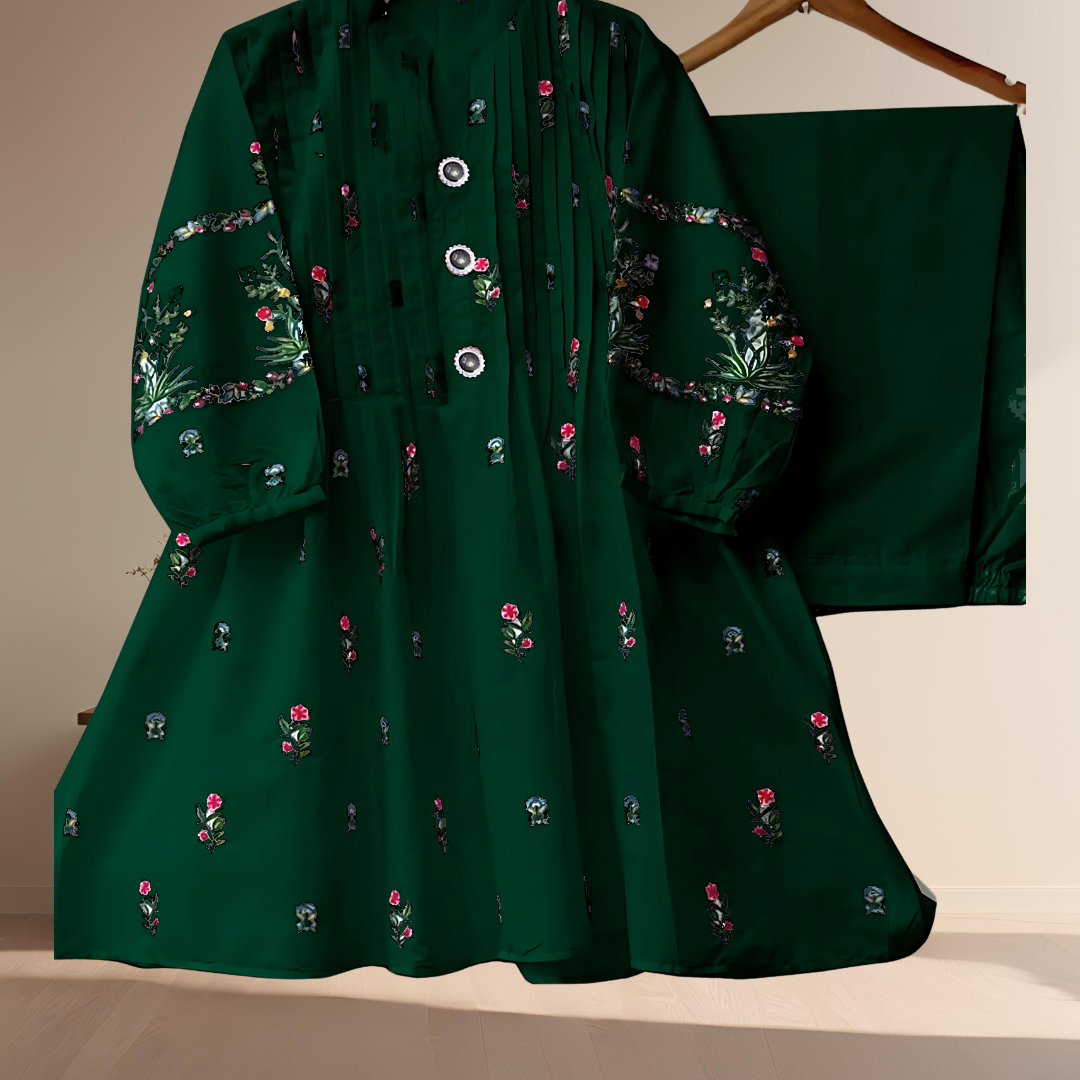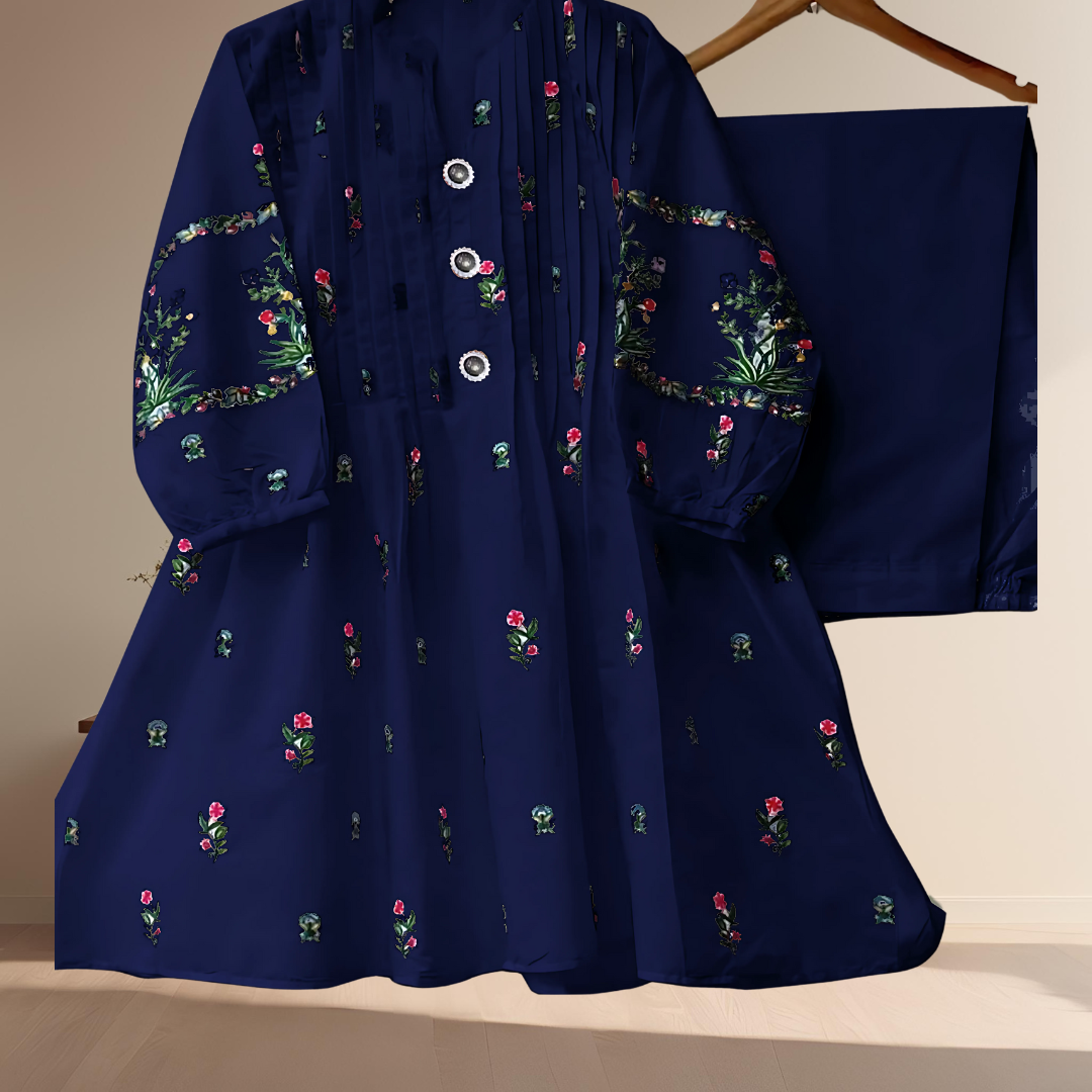 - V Neck Embroidered Button Shirt With Trouser 2 Piece